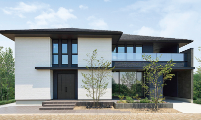- 家族みんなが幸せで、楽しめる充実した空間を実現しているおうち・建物正面はホワイト&ブラックのコントラストが、背面は大判のプレセットタイルの重厚感が強い印象を与え、開放感のあるガレージでリビングとの繋がりを実現しています