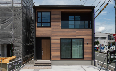 - モダンな佇まいと気品を感じる、ソフトシックスタイルの等身大モデルハウス・シックな黒を基調にウッド柄をアクセントとした高級感のあるフラット外壁を採用